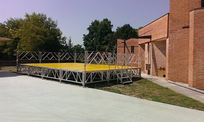 Pordenone Palco modulare in acciaio zincato , parapetto su tre lati e scala di accesso; pavimentazione in abete lamellare.