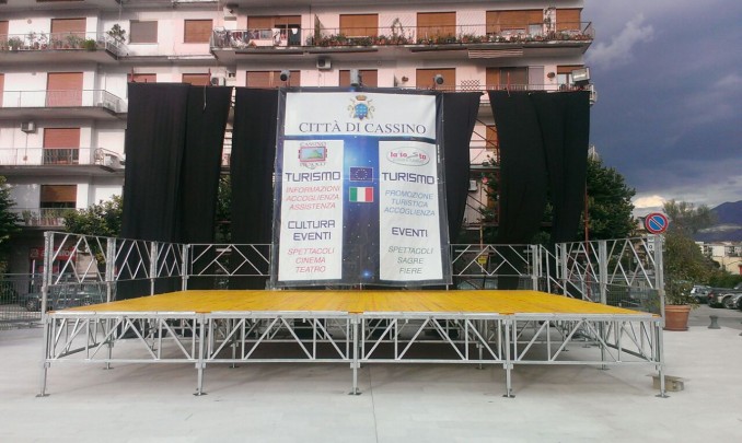 Proloco Città di Cassino (FR) Palco modulare in acciaio zincato, parapetto su tre lati e scala di accesso laterale; pavimentazione in abete lamellare.